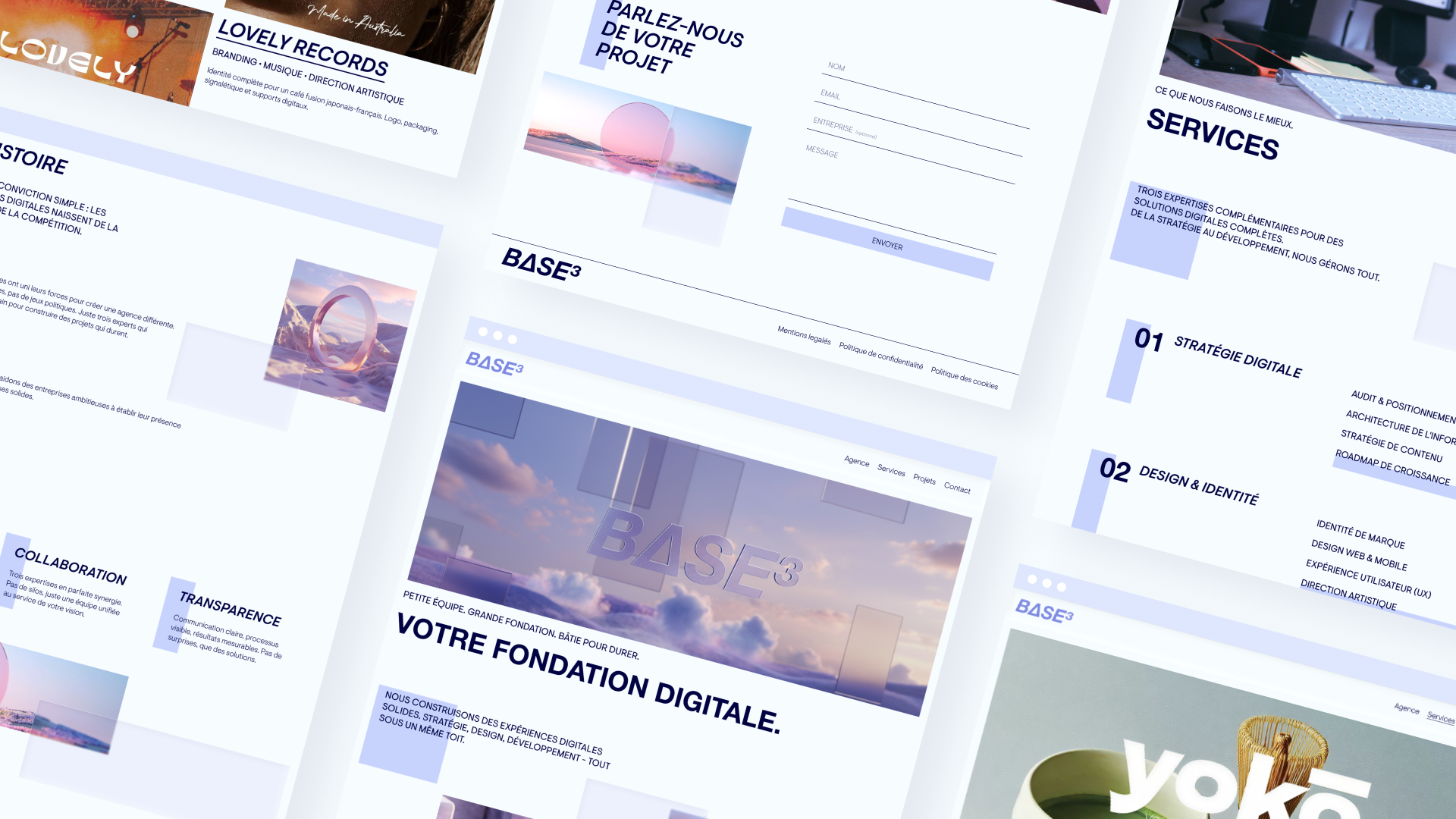 BASE3 – це вигадана агенція, яку я придумав у рамках свого екзаменаційного проекту. Мета полягала в тому, щоб створити агенцію, яка б приваблювала місцевих клієнтів з сектору малого бізнесу, пропонуючи при цьому високоякісний продукт.