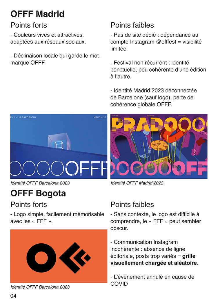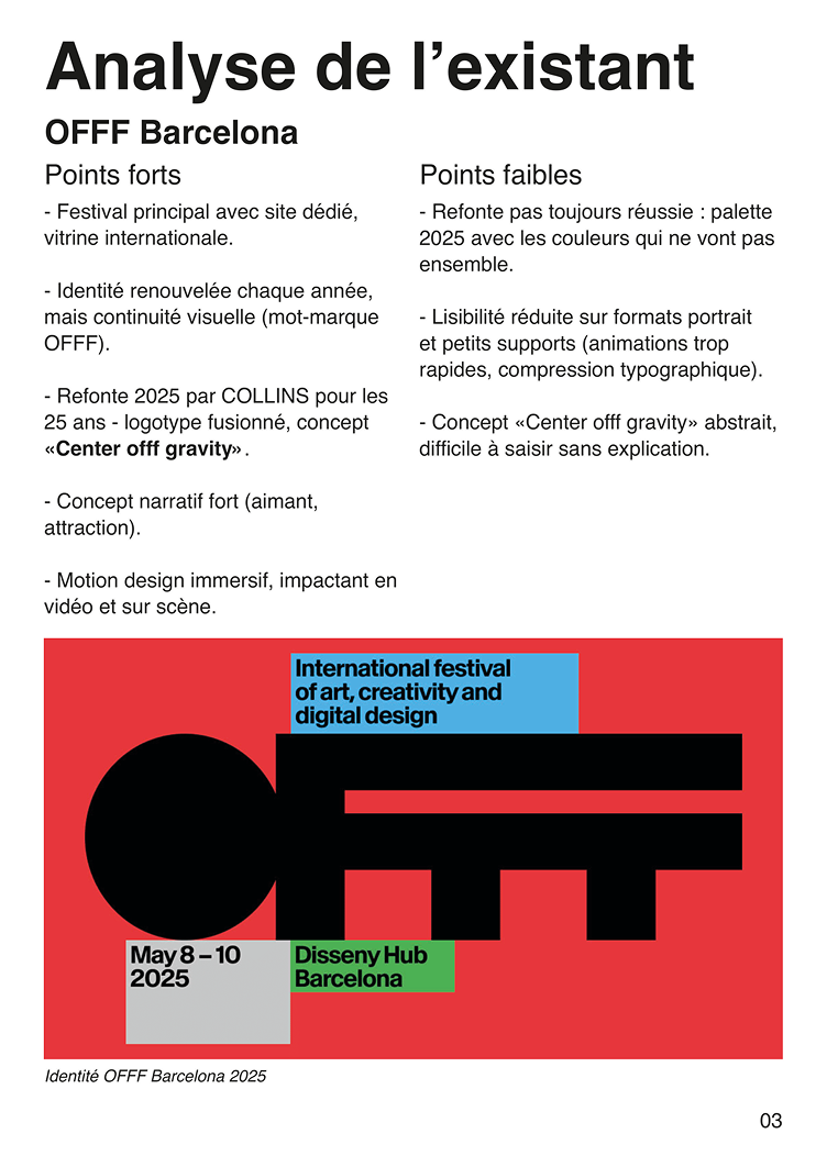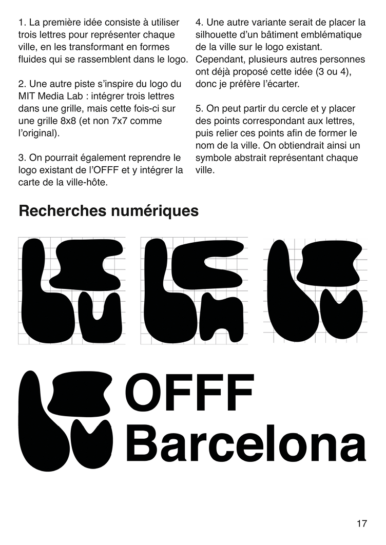 OFFF – це фестиваль графічного дизайну, який щовесни проходить у Барселоні, а також у кількох інших містах протягом року. Мета проєкту полягала в тому, щоб переосмислити візуальну айдентику OFFF та створити поліморфний логотип, який адаптується до кожної редакції фестивалю (Барселона, Мадрид, Богота, Шанхай та потенційно інші). Проєкт складався з чотирьох частин: дослідження, створення візуальної айдентики, розробки тизеру та прототипування застосунку.